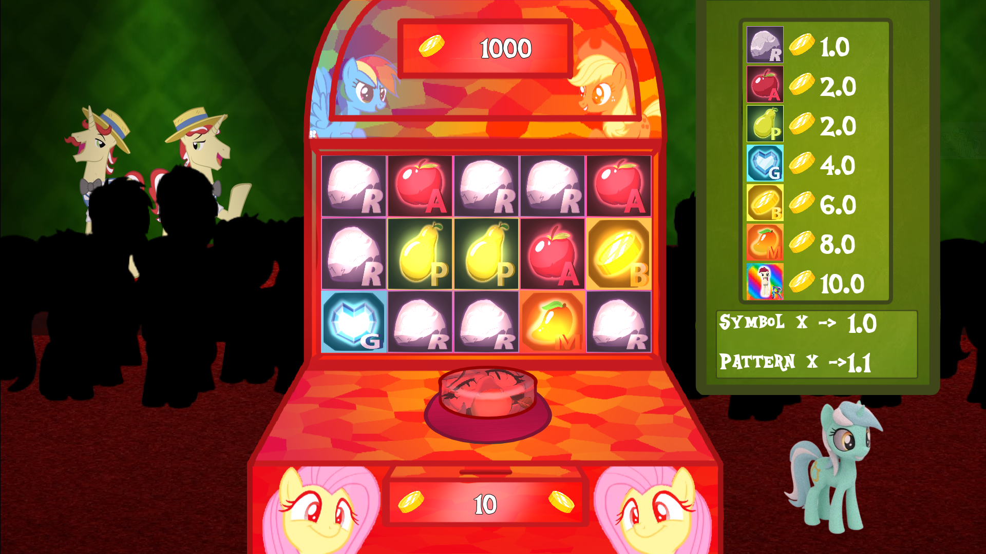 Flim and Flam are back in town! Always scheming something, this time they've build a casino smack-dab in the middle of Ponyville! Of course they don't ever play fair and (YOU) have a hunch that this time, it won't be any different. With a cutie mark promising to break any slot machine, you will make an end to their stupid games, by breaking the bank!